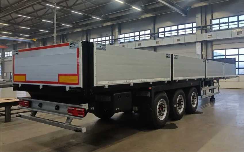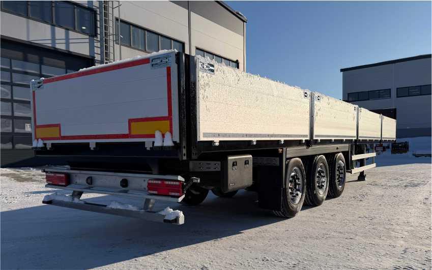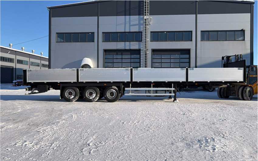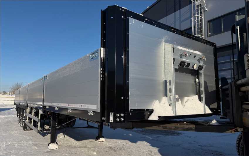 Передний, задний и боковые борта алюминиевые, средние стойки откидные (BPW). Полуприцеп легко трансформируется в открытую платформу благодаря съемным бортам и стойкам. 2 корзины под запасное колесо полуприцепа и автомобиля.
